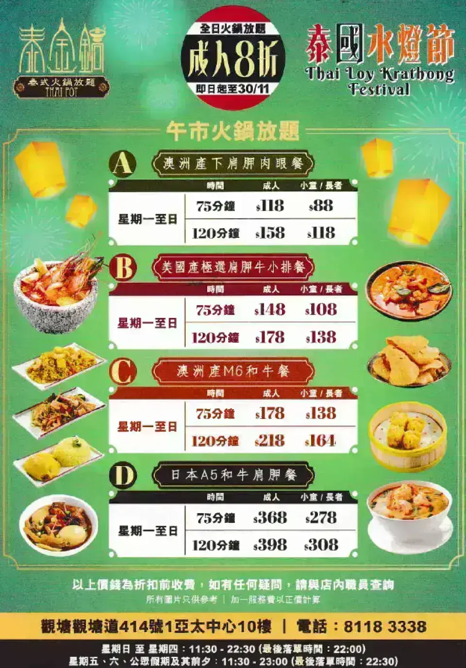 【港飲港食】特色泰式+火鍋放題 ‖ 仲有流水蝦 ‖ 半放題$88 全放題$118 ‖ 任飲任食 多款泰式小食、靚靚肉類、火鍋配料、湯、點心、甜品、雪糕雪條、飲品啤酒等 ‖ 荃灣/旺角/觀塘 ‖ 泰金鍋 慳玩。狂遊*狂食 2025-05-10