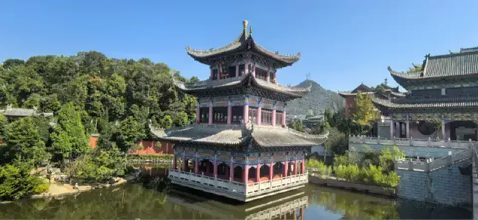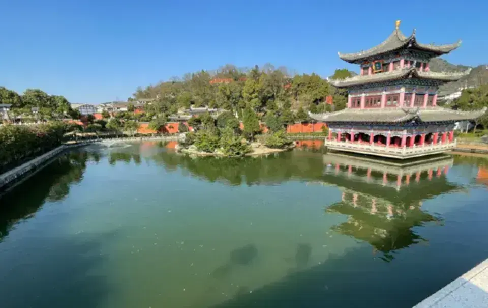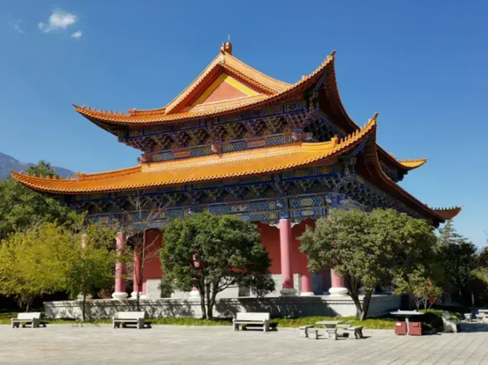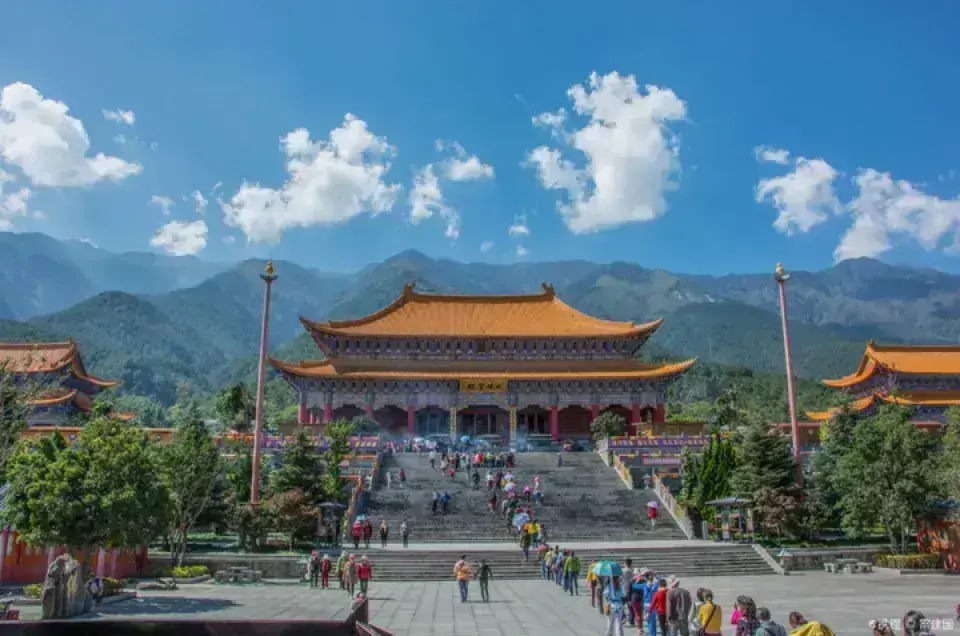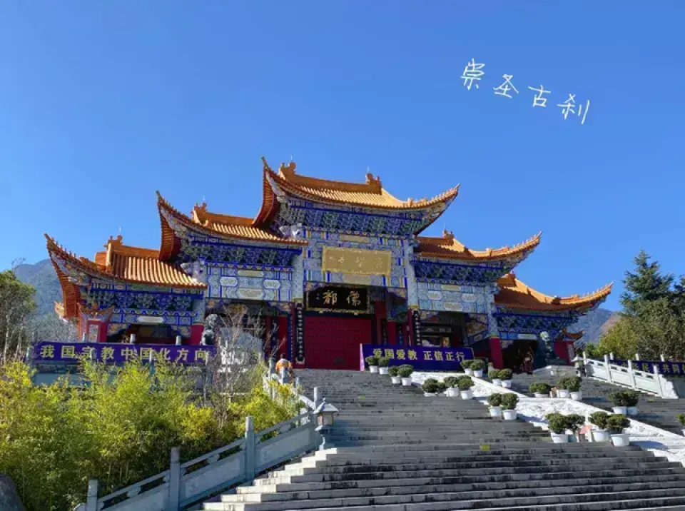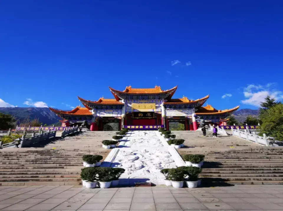 崇圣寺位于大理古城北1.5公里处,是大理国时期的皇家寺院。这里东临洱海,西靠苍山应乐峰,风景十分优美。三塔原来是崇圣寺的一部分,如今看到的寺院是重建的,而三塔则是已有千年历史的遗迹,也是来此的很大看点。参观路线进景区入大门,迎面就能看到位于景区中轴线台阶之上的三塔。前方正中的大塔叫千寻塔,与南北两个小塔呈三足鼎立之势,颇为大气。三塔的造型与西安小雁塔相似,拍摄三塔绝妙的地点是它斜后方三塔倒影公园的“三塔聚影池”,在这里可以拍到三塔和池中的倒影,许多游客在这里拍照留念。绕过三塔,沿着中轴线往里走,沿路可在文物陈列馆看维修三塔的过程中发掘出土的南诏、大理国文物,在钟楼看重达16吨的南诏建极大钟,在雨铜观音殿看雨铜观音,最后便可来到崇圣寺。崇圣寺如今的崇圣寺是2005年重建的,规模宏大,可以感受到当年南诏、大理时期皇家寺院的气派,寺内各种各样的龙共1万多条,是全国龙最多的寺院。另外,寺内还有一面全国很大的牛皮大鼓,直径3.1米,用一整块牛皮制成,值得一看。