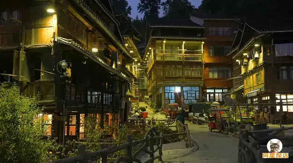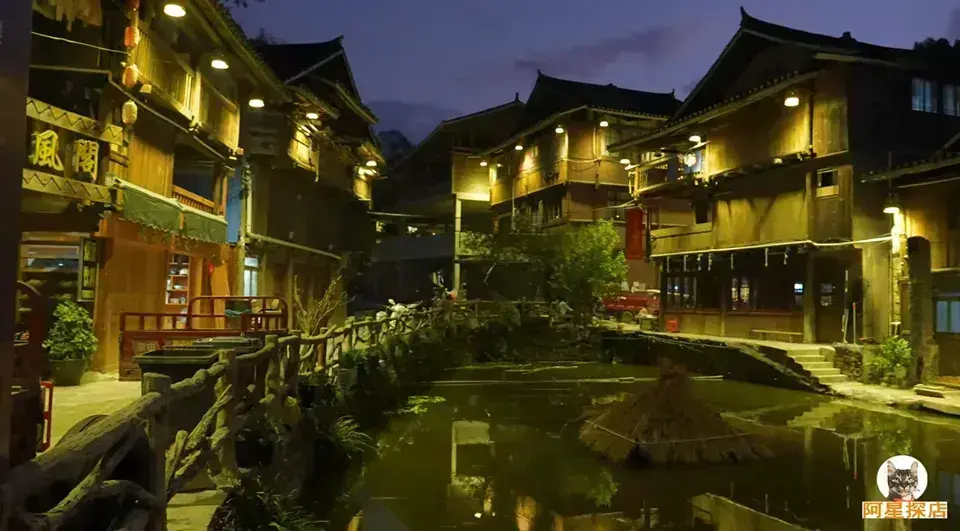 寨中房屋为干栏式吊脚楼,鳞次栉比,错落有致,全部用杉木建造,硬山顶覆小青瓦,古朴实用。整个寨子能看到全景的制高点是肇兴中学观景点,在这里能清晰看到整个肇兴侗寨的全貌。另一处是猛猫花桥下游新建的第六座风雨桥对面的小山坡,在那里也能看到肇兴的全景。晚上你可以在这里享受小镇酒吧和露天演出,感受一下侗族风情。