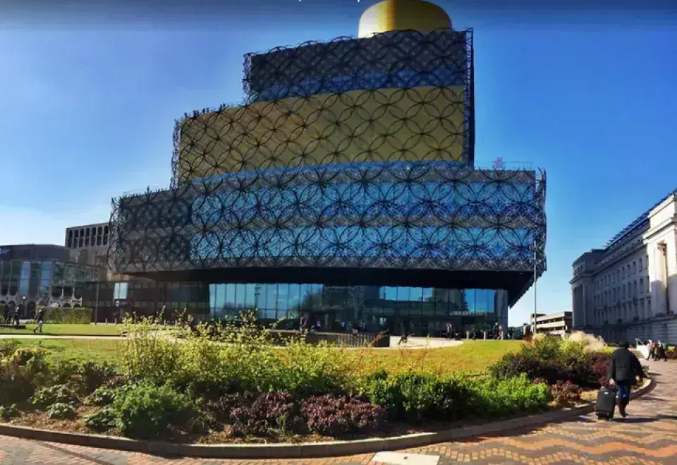 伯明翰圖書館是歐洲最大的現代公共圖書館之一,同時也是伯明翰市的文化中心。圖書館是一座具有獨特現代設計的地標性建築,外觀有著別具一格的網狀結構,內部則擁有寬敞且光線充足的空間,從高層可以欣賞到伯明翰市的全景。圖書館內有多個戶外露台,其中包括位於7樓的“秘密花園”,這是一個讓人放鬆的綠意空間,並且提供絕佳的城市景觀。