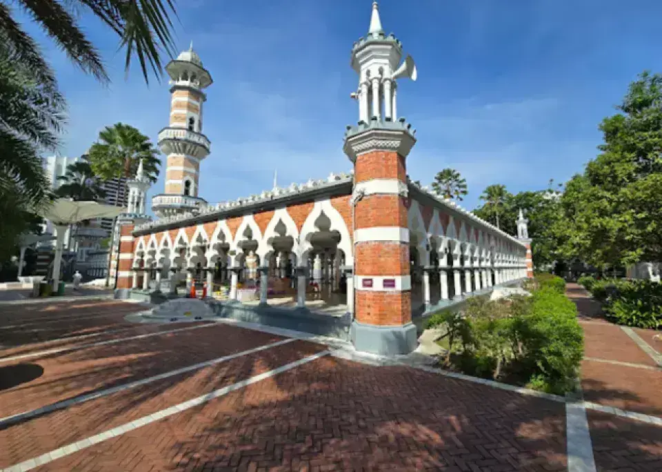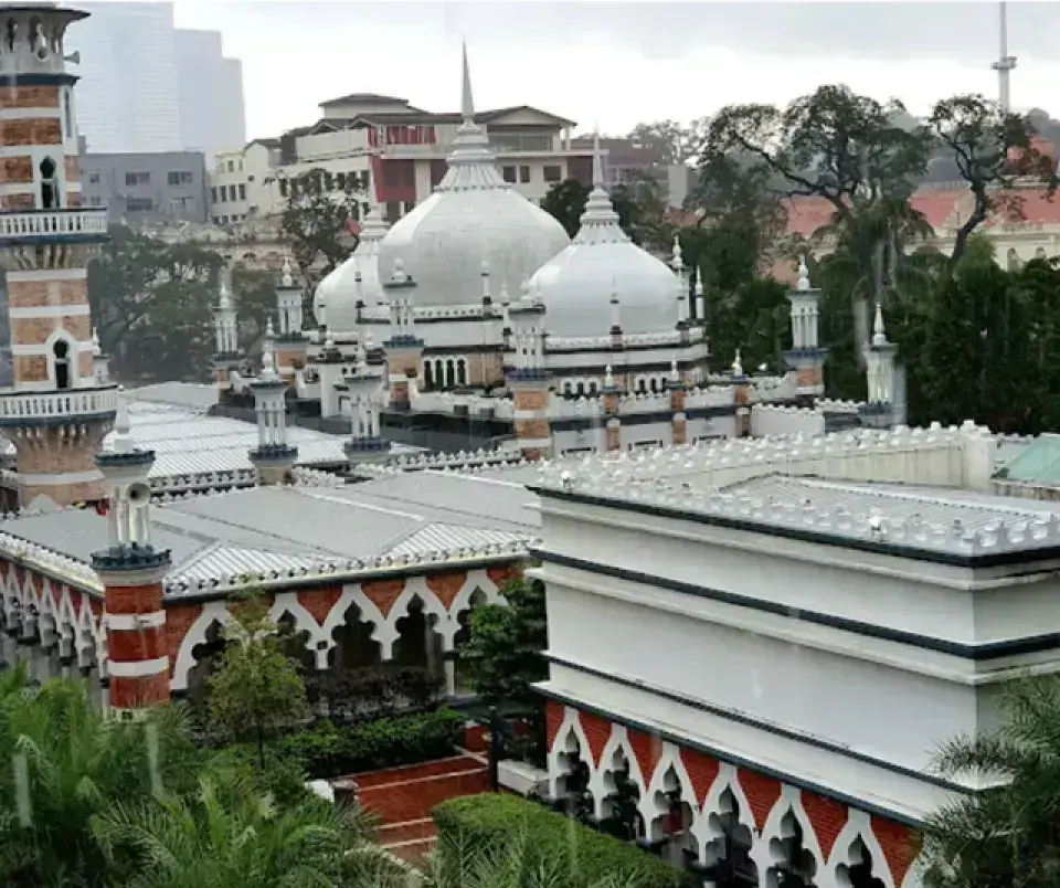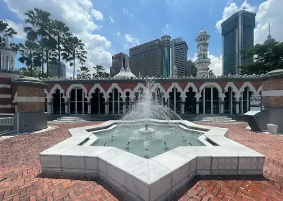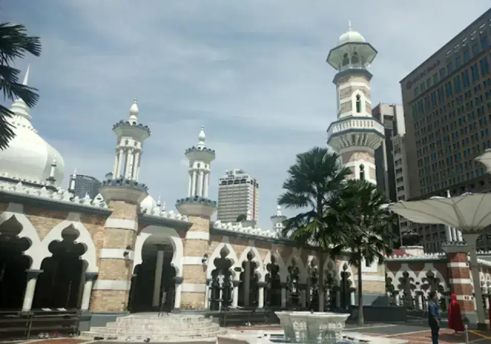 Masjid Jamek (蘇丹阿都沙末清真寺) 建於 1909 年,是吉隆坡最古老的清真寺之一,以摩爾式建築、尖拱與圓頂聞名。