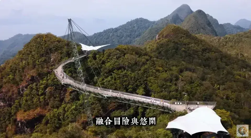 天空纜車和天橋 乘坐纜車到海拔700公尺的馬西崗山頂,俯瞰蘭卡威全景 [33:11]。成人單程票價約50馬幣 [33:16]。天空橋長125公尺,懸掛在山間,彷彿在天上行走 [33:22]。由於天氣原因,天空纜車有時會暫停營運 [34:38]。