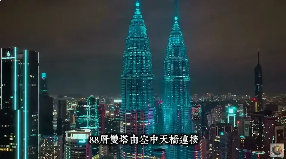 雙子塔,又稱雙峰塔,位於吉隆坡市中心 [37:18],是吉隆坡最著名的地標,曾是世界最高的摩天大樓。這兩座88層樓的建築高達451公尺,以其獨特的伊斯蘭建築風格和高空連廊而聞名,現在是馬來西亞現代化的象徵 [37:22]。