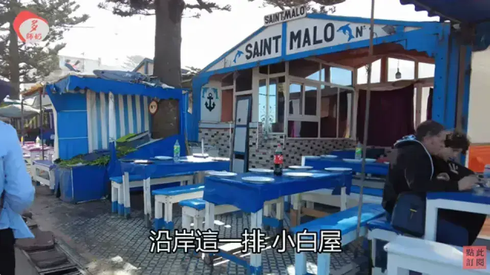 摩洛哥索維拉 (Essaouira, Morocco) 港口旁的 藍白木屋海鮮燒烤餐廳區。這裡不是單一餐廳,而是一整排相鄰的小攤/小餐館。主打現抓海鮮炭烤,有固定套餐(魚、蝦、魷魚、龍蝦可選配)。食客可以直接挑選食材,議價後交給店家烤。