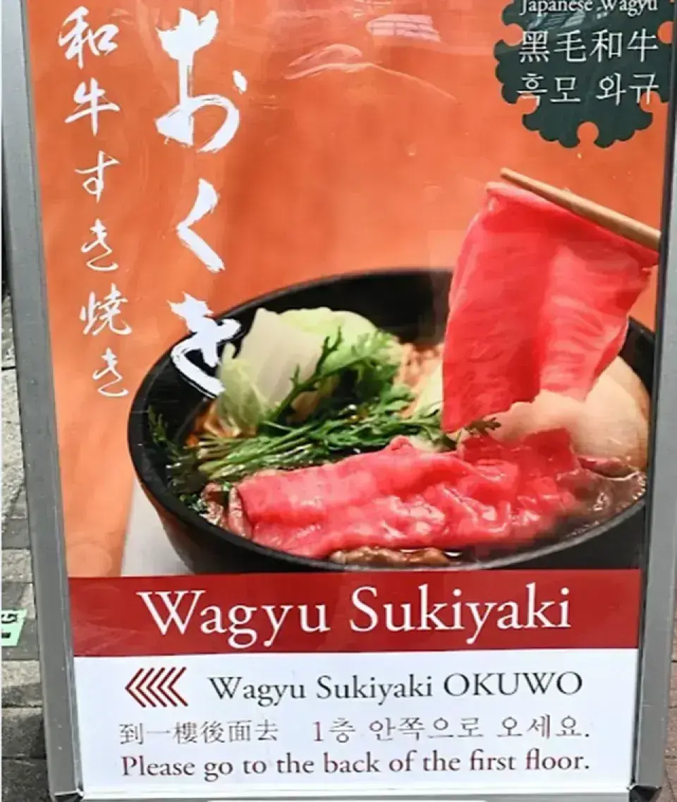 主打和牛壽喜燒的午市限定店,地點隱蔽、座位以吧檯為主,臨近法善寺與千日前商圈。餐點重心在高等級和牛,份量有不同級距可選。適合想在難波一帶吃到精緻壽喜燒的旅客。