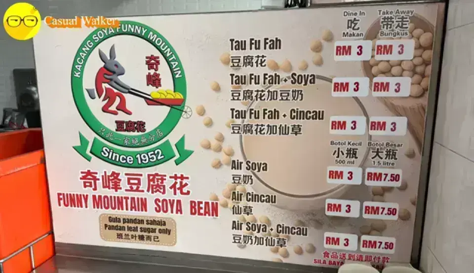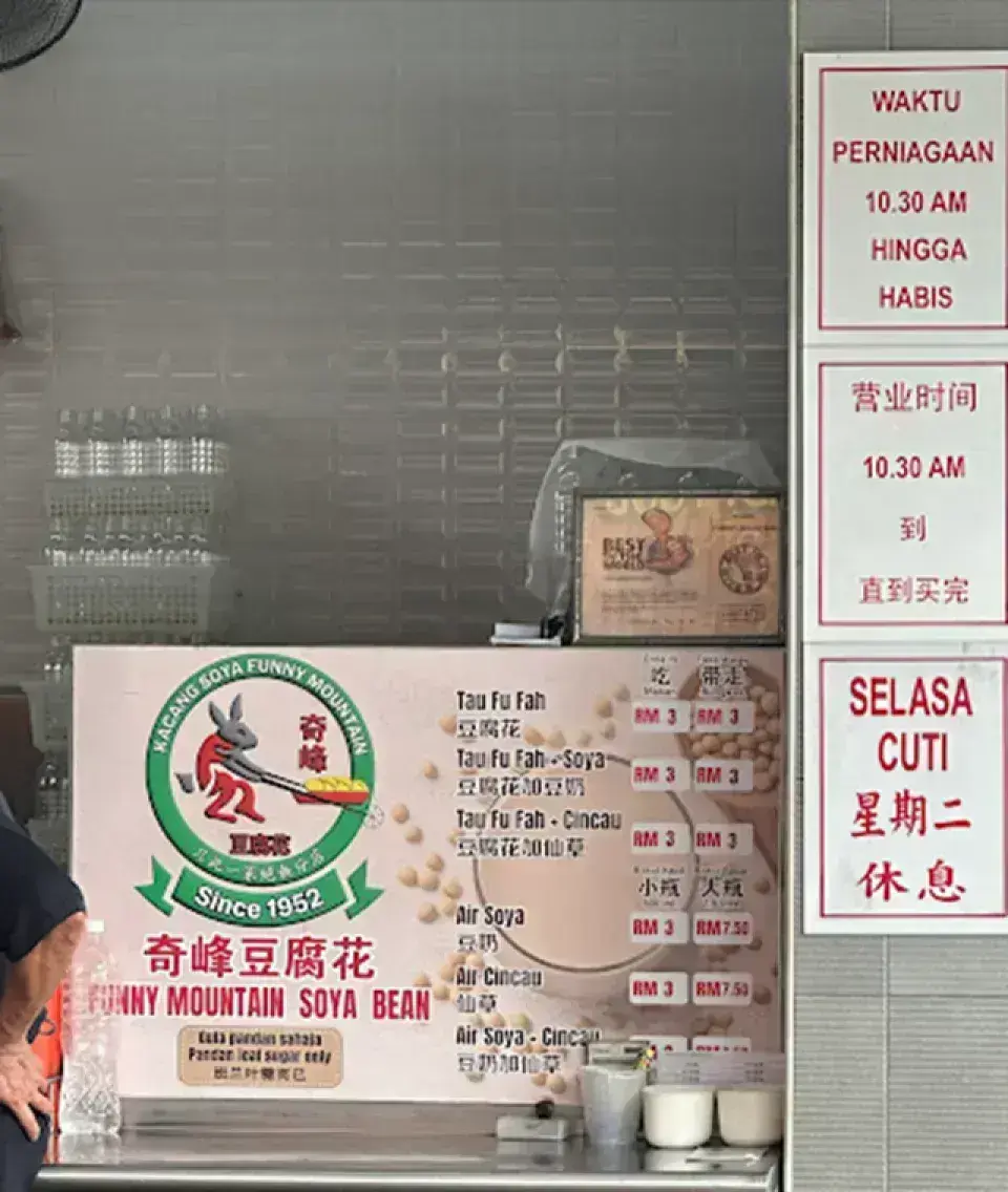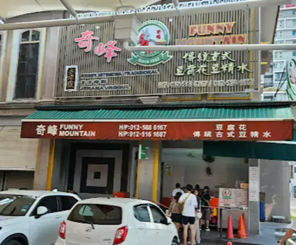 奇峰豆腐花是怡保的必吃小吃,以其絲滑如綢的豆腐花聞名。這家店的特色是「得來速」(drive-thru) 的銷售方式,顧客可以直接在車上購買,無需下車。這裡的豆腐花口感滑嫩,入口即化,可以選擇搭配薑糖水或白糖水。