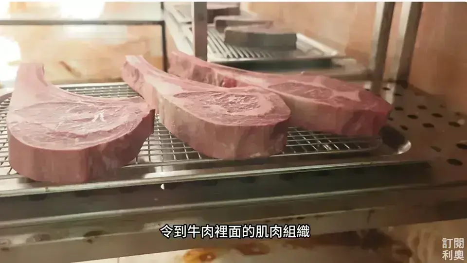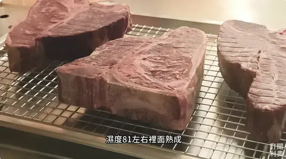 熟成牛扒的意思,就是用溫度大概0至4度,濕度81左右裏面熟成,進行脫水發酵,令牛肉裏面的肌肉組織在蛋白酶素的作用下分解,令肉質更加嫩滑,通常要28日以上