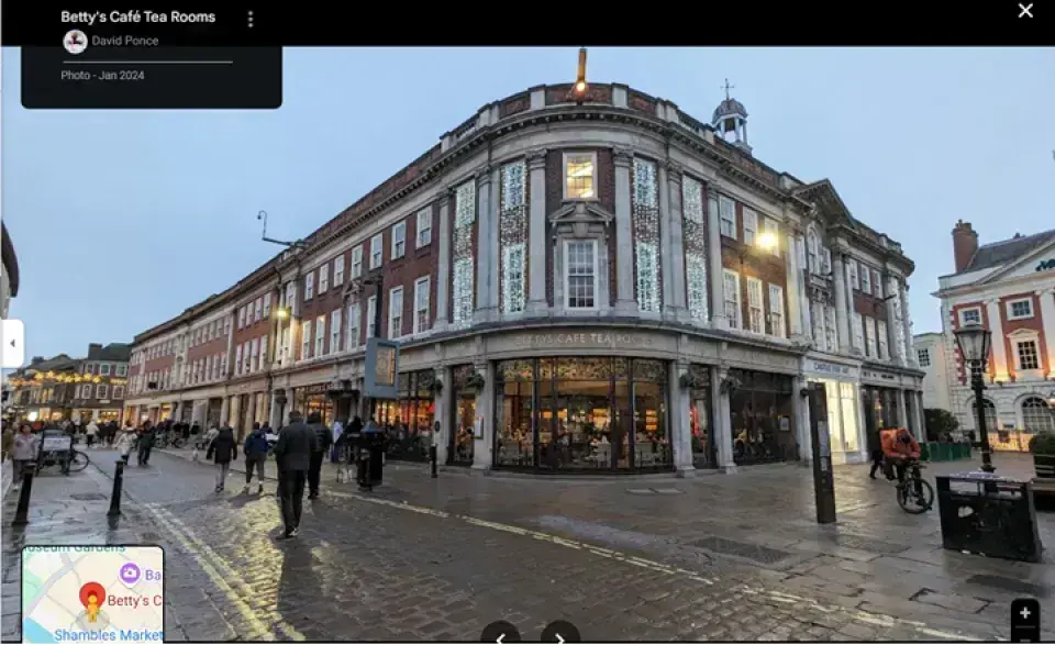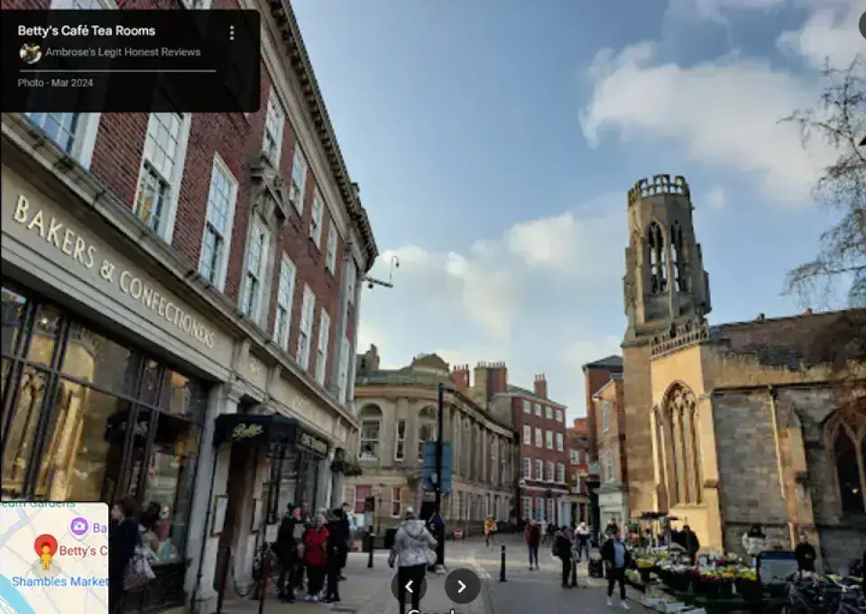 Bettys位於市中心的St. Helen’s Square,非常容易找到。從約克火車站步行約10-15分鐘即可到達。你可以沿著River Ouse河邊散步,然後穿過市中心到達。 -