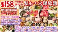 午市 $158 中式點心 + 火鍋放題,不限時任飲任食,多款點心 (蝦餃 / 燒賣 / 小籠包 / 牛肉等) + 多款火鍋配料 (牛肉 / 牛𦟌 / 脆鯇 / 蝦/丸 / 餃 / 瓜菜等) + 飲品 (汽水 / 啤酒 / 維他奶 / 果汁等),晚市 $215