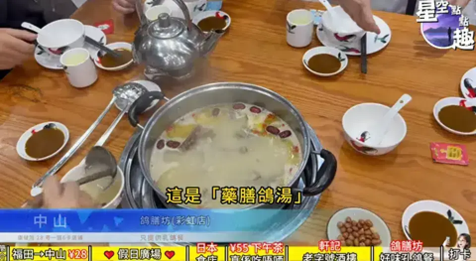 鴿膳坊是一間專做乳鴿料理的專門店/火鍋小館,主打藥膳鴿湯、鹽焗/紅燒乳鴿等鴿子菜式,在中山西區一帶很有人氣。圍繞「鴿」做全套餐,有藥膳鴿湯、乳鴿、鴿飯、鴿腎竹筒飯等,很多港澳遊客專登去試。